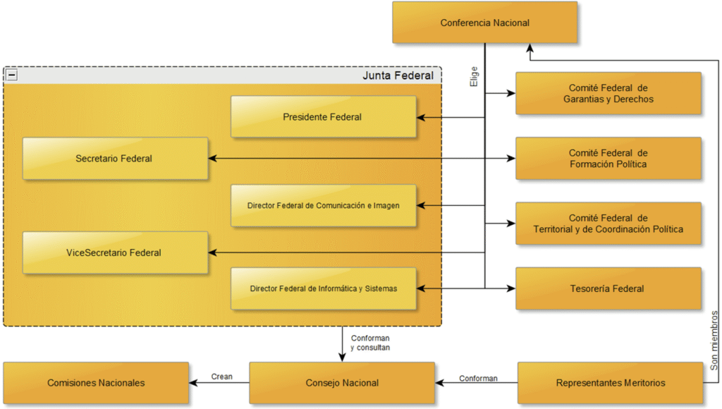 - Secretario Federal (2 años de cargo): Responsable administrativo y garante del cumplimiento del proyecto presidencial a nivel nacional. Su función principal es la elaboración de los informes semestrales, que determinan los votos federales asignados a cada partido, así como las cuotas anuales y la transparencia.